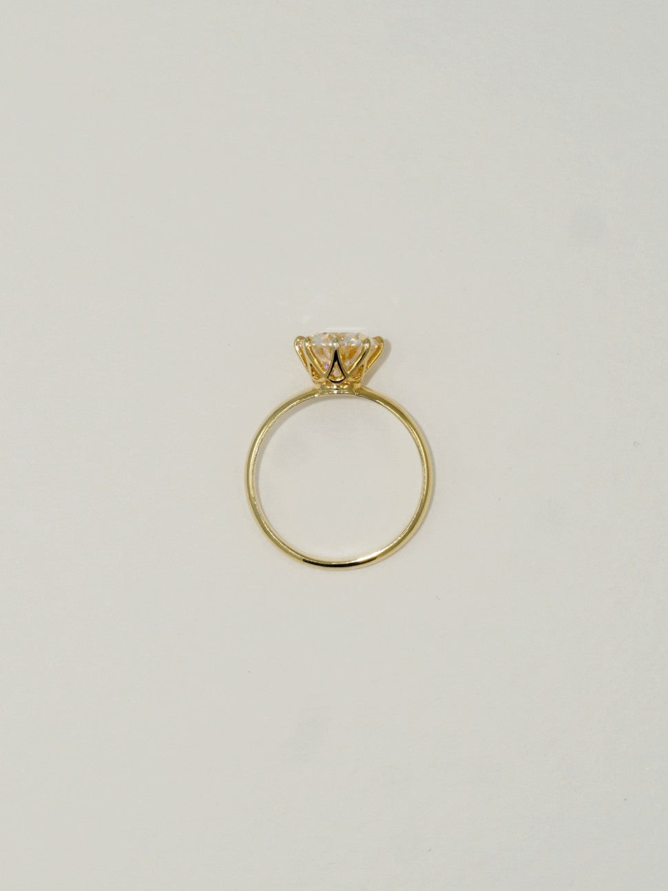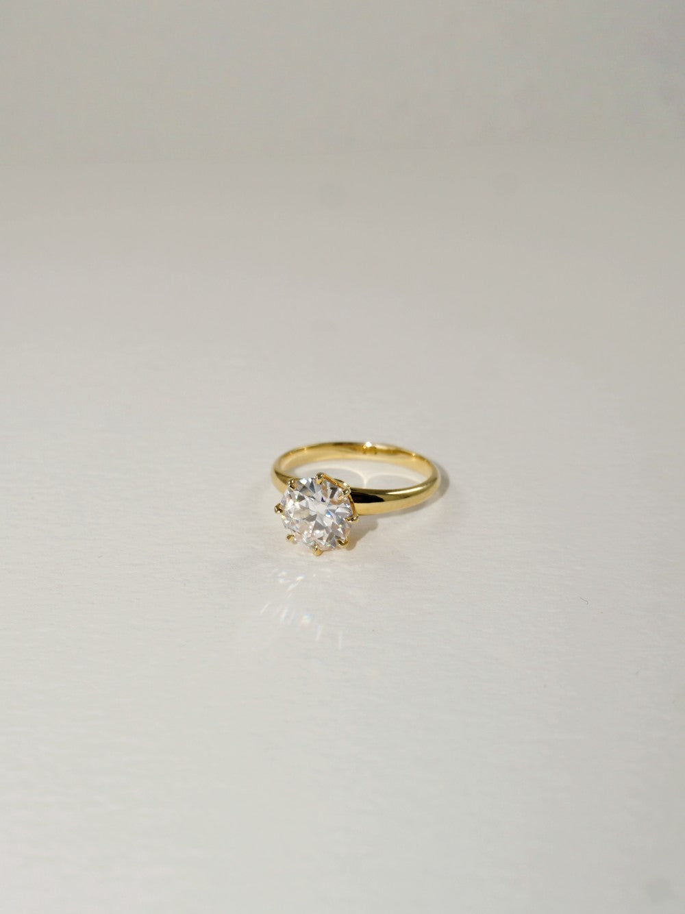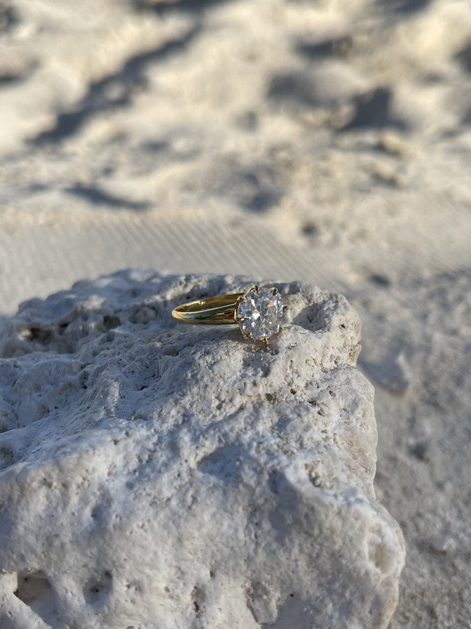 Centering an old European-cut lab grown diamond weighing approximately 2.00 carats; mounted in solid gold.