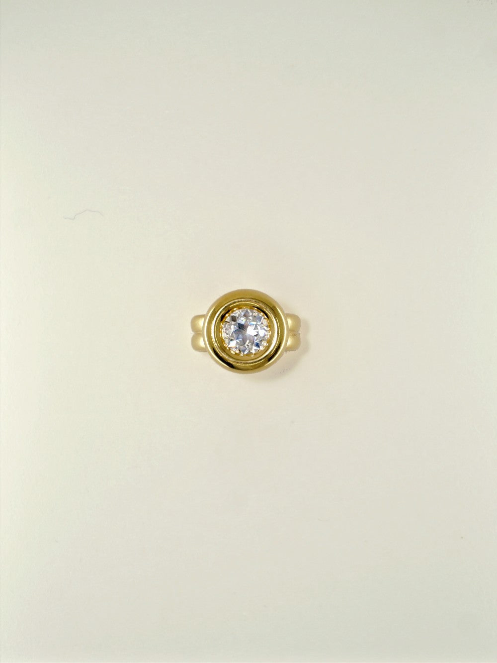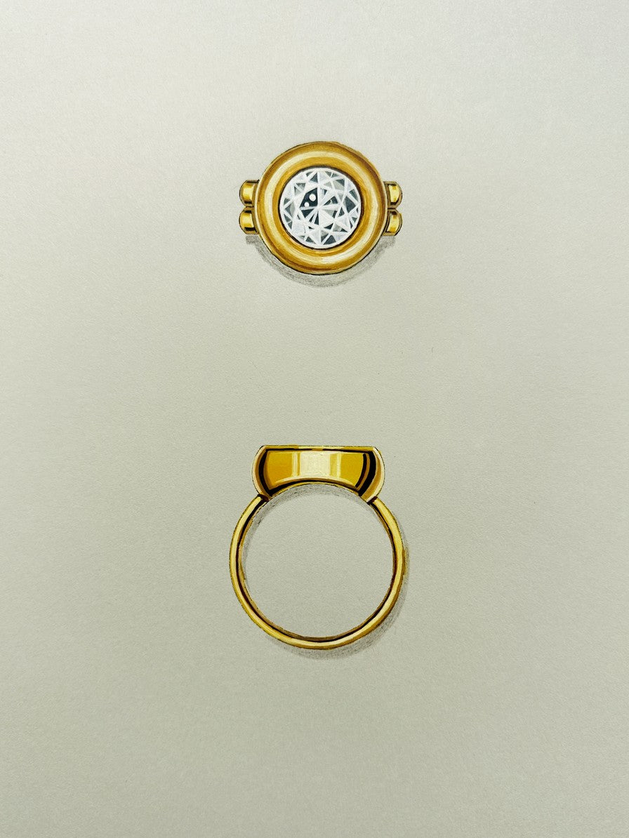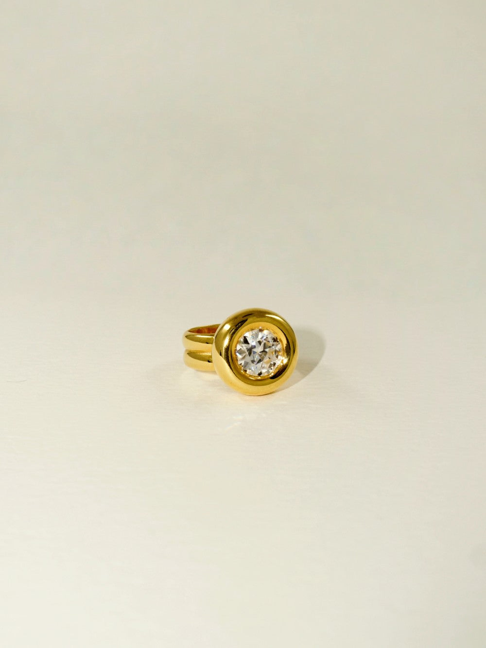 The diamond is not perched but held— balanced old-cut sparkle nested in a wide plane of gold that speaks not of delicacy, but of balance and certainty. There’s a quiet gravity to it, a calm authority.