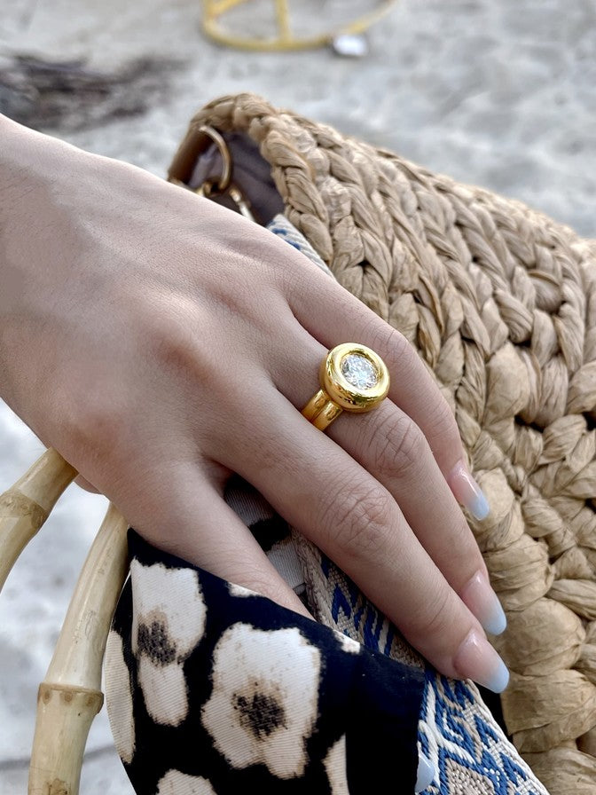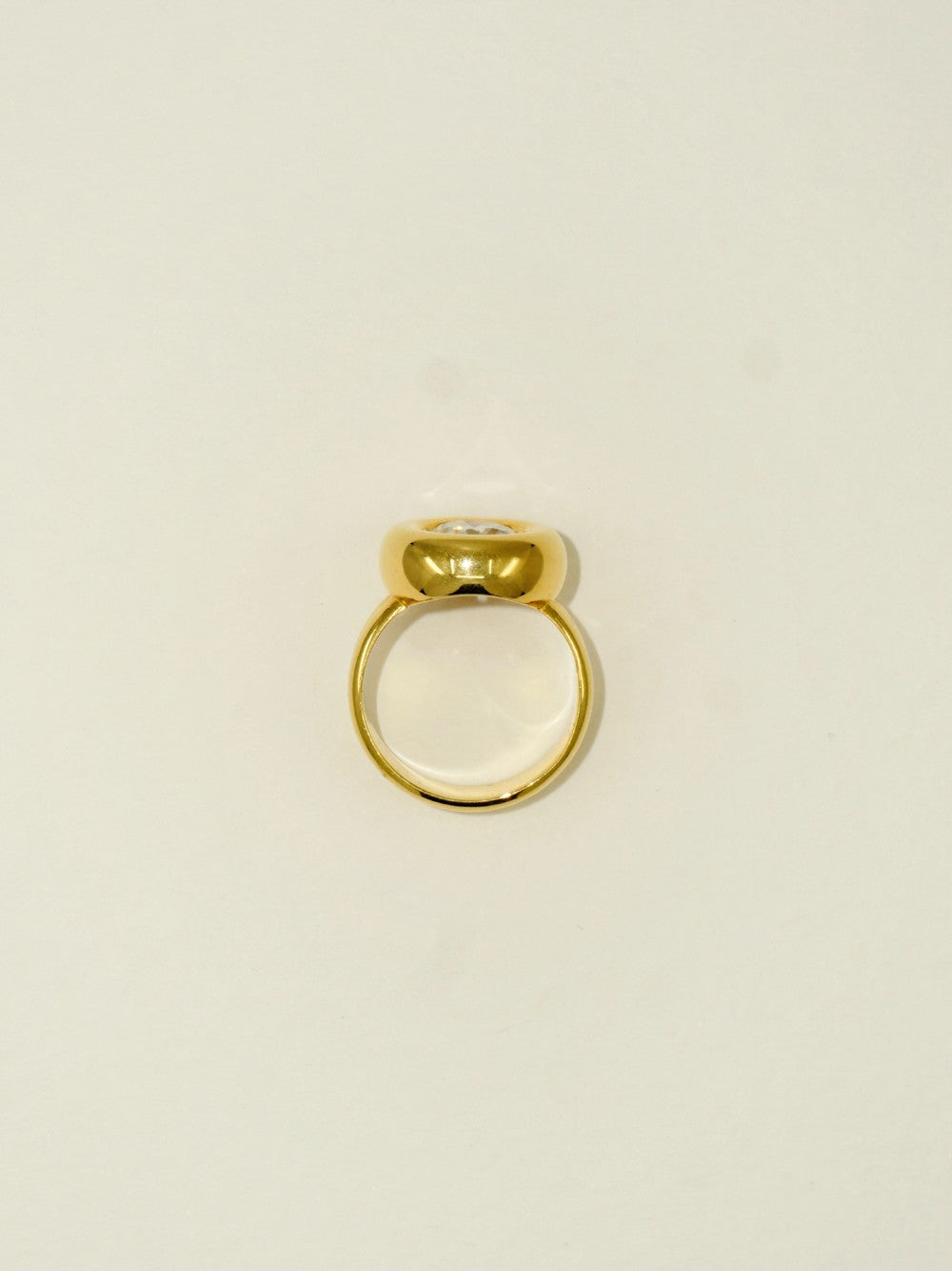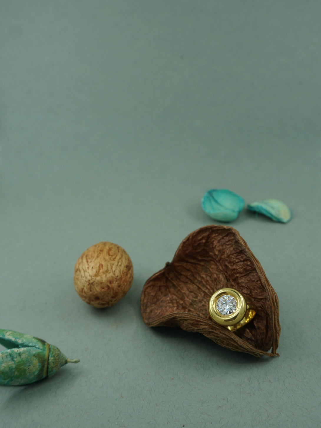 The diamond is not perched but held— balanced old-cut sparkle nested in a wide plane of gold that speaks not of delicacy, but of balance and certainty. There’s a quiet gravity to it, a calm authority.